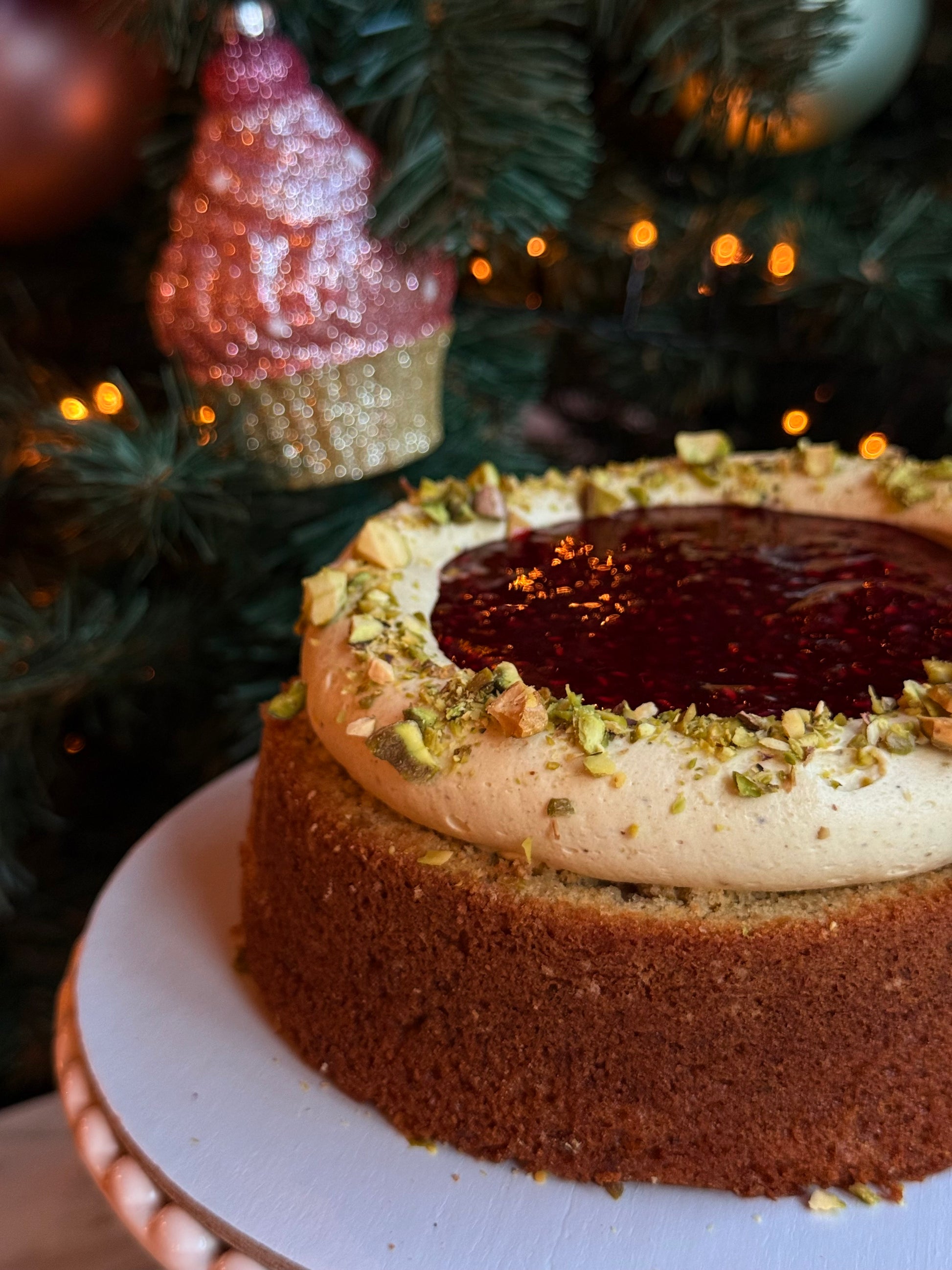 Een feestelijke taart met een laag pistache cake, gevuld met pistachecrème en een heerlijke frambozenjam. Afgewerkt met pistachenoten voor een luxe bite. Perfect voor een elegante kersttafel.